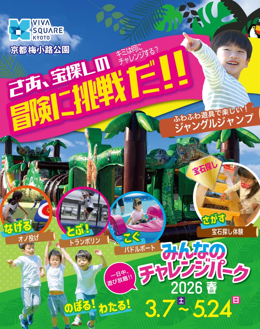 この春、梅小路公園にアクティブに遊べる新スポットが登場しました!目玉の「ジャングルジャンプ」や、水面をスイスイ進む「パドルボート」、高く跳ねて楽しい「トランポリン」など、子供から大人まで夢中になれるアトラクションが勢揃い。