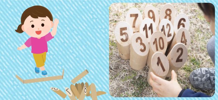 木製のピンを倒して得点を競おう。 -