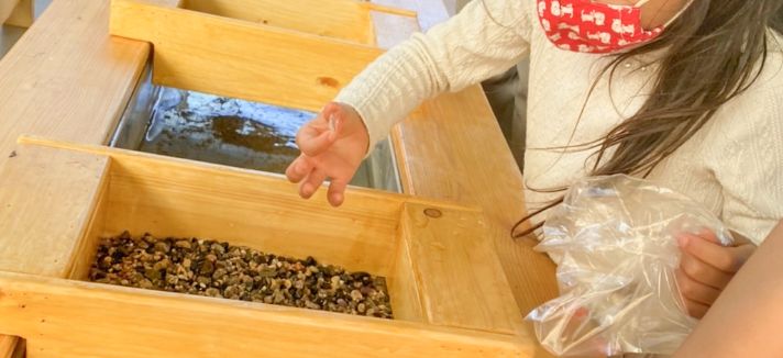 - 砂利の中から宝石を見つけます。細かい砂は水にさらしてふるい落とします。