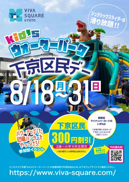 京都駅から1駅、梅小路公園にウォーターパークが登場!駅前で子どもたちはおおはしゃぎ!キッズウォーターパークは、大きなウォータースライダーなど、みんなで楽しめるアトラクションがいっぱい。今年の夏はビバスクエアで遊びつくそう!